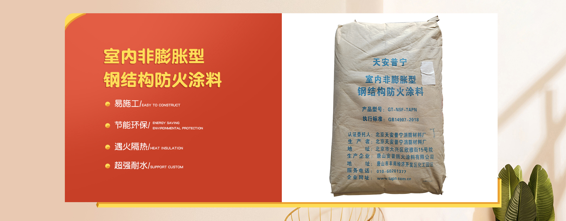 北京天安普寧消防材料廠是一家從事防火涂料二十多年生產企業,企業集研制開發、生產銷售及各類防火涂料施工為一體。 企業員工總數100人,其中管理人員20人,科研人員10人,銷售50人,其他員工十多人。企業生產用地面積2000平方米左右,辦公用地面積1000平方米。擁有先進的生產設備20多臺,年生產量10000余噸。 企業擁有一支高學歷、資歷深的研發隊伍,以科學的管理,先進成套的生產流水線設備及完善的產品質量檢驗措施,開發出TAPN系列防火涂料產品,可以滿足于各類建筑工程中不同基材、不同技術要求的防火保護,天安普寧系列防火涂料全部經過《國家消防及阻燃產品質量監督檢驗中心》檢驗,理化性能合格,防火性能高,通過《應急管理部消防產品合格評定中心》認證并獲得《消防身份信息標識》。 企業結合多年的工程施工實踐經驗,培養了一支專業有素、經驗豐富、高質量、效率高的防火涂料施工隊伍,可承攬各類高層、多層、大跨度廠房及網架鋼結構防火涂料噴涂施工服務。 企業始終為用戶全心全意服務,不斷滿足各建設單位的要求,共同為我國的建筑消防事業作出更大的貢獻,衷心感謝新老客戶的支持,全體員工熱情歡迎廣大用戶的光臨惠顧。